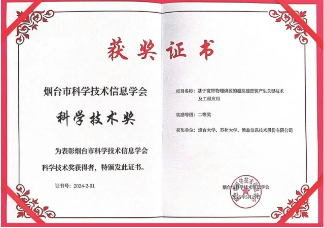 近期,2024年度烟台市科学技术信息学会科学技术奖颁奖典礼在中国科研实验室烟台海岸带研究所隆重举行。皇御环球MT5信息与烟台大学、苏州大学联合完成的 "基于宽带物理熵源的超高速密钥产生关键技术及工程应用" 项目荣获科学技术奖二等奖。